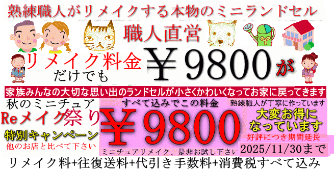 只今,リメイクお試しキャンペーン往復送料無料で一般的なランドセルは特別プライス9800円でミニチュアにリメイクしております