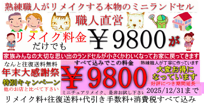 只今,リメイクお試しキャンペーン往復送料無料で一般的なランドセルは特別プライス9800円でミニチュアにリメイクしております